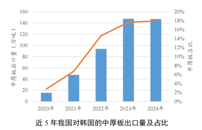 近五年,我国对韩国的钢材出口呈波动增长态势,其中中厚板占比呈稳定增长态势。2024年,我国对韩国的钢材出口总量818.75万吨,同比下降1.9%,较2020年增长46.9%;其中,对韩中厚板出口量147万吨,同比基本持平,但比2020年增长846.6%;占出口韩国钢材总量的18%,占我国中厚板出口量的14.1%。