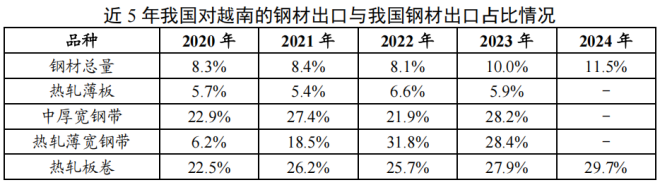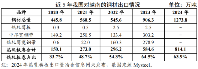 近五年,我国对越南的钢材出口大幅增长,其中热轧卷板出口占比增长较快。2024年我国对越南的钢材出口总量1273.84万吨,同比增长40.5%,较2020年增长185.8%;其中热轧板卷出口814.14万吨,同比增长39.3%,但比2020年增长442.2%;占对越南出口钢材总量的64%,占我国热轧板卷出口总量的29.7%。
