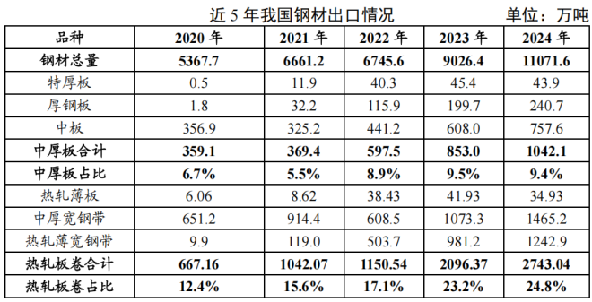 近五年,我国钢材出口量持续增长态势。2024年,我国钢材出口总量达到11071.55万吨,同比增长22.7%,较2020年增长106.3%。其中,2024年中厚板出口总量1042.10万吨,同比增长22.2%,占出口钢材总量的9.4%;热轧板卷出口总量2743.04万吨,同比增长30.8%,占出口钢材总量的24.8%。
