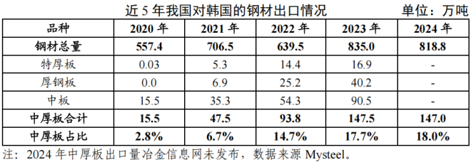 近五年,我国对韩国的钢材出口呈波动增长态势,其中中厚板占比呈稳定增长态势。2024年,我国对韩国的钢材出口总量818.75万吨,同比下降1.9%,较2020年增长46.9%;其中,对韩中厚板出口量147万吨,同比基本持平,但比2020年增长846.6%;占出口韩国钢材总量的18%,占我国中厚板出口量的14.1%。