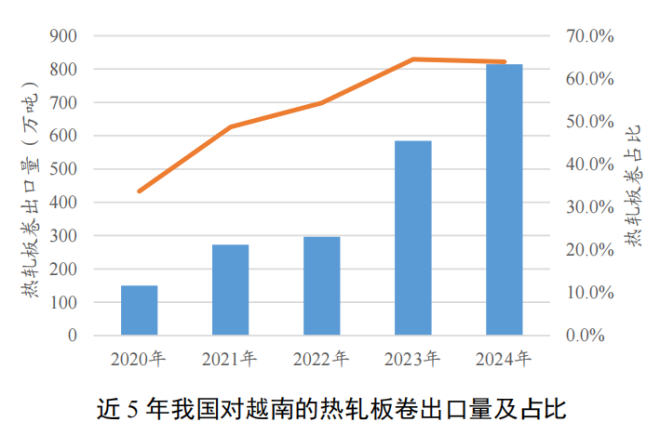 近五年,我国对越南的钢材出口大幅增长,其中热轧卷板出口占比增长较快。2024年我国对越南的钢材出口总量1273.84万吨,同比增长40.5%,较2020年增长185.8%;其中热轧板卷出口814.14万吨,同比增长39.3%,但比2020年增长442.2%;占对越南出口钢材总量的64%,占我国热轧板卷出口总量的29.7%。